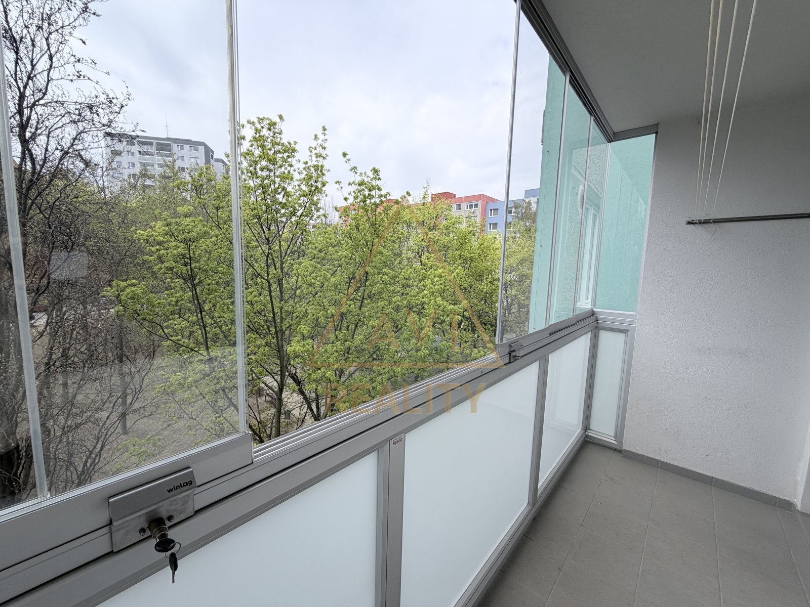 V bytě jsou plastová okna se žaluziemi, podlahy tvoří kombinace plovoucí podlahy, dlažby a PVC.